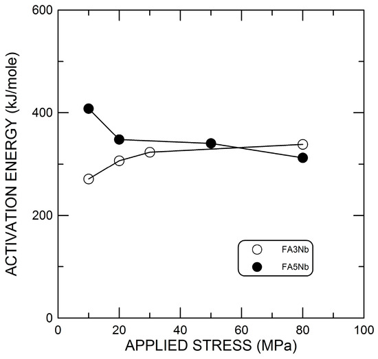 where T is the absolute temperature, and R is the universal gas constant, can be determined separately for both regions, although this determination should be taken with great caution at temperatures below 700 °C. The estimated activation energies for the high-temperature region are given in Figure 8. The activation energy is close to 335 kJ/mol reported by McKamey et al. [11] for the Fe-28Al-1Nb alloy. It is also comparable to the activation enthalpy of the diffusion of the niobium in Fe(Al) as estimated by Morris et al. [24], i.e., 330 kJ/mole.