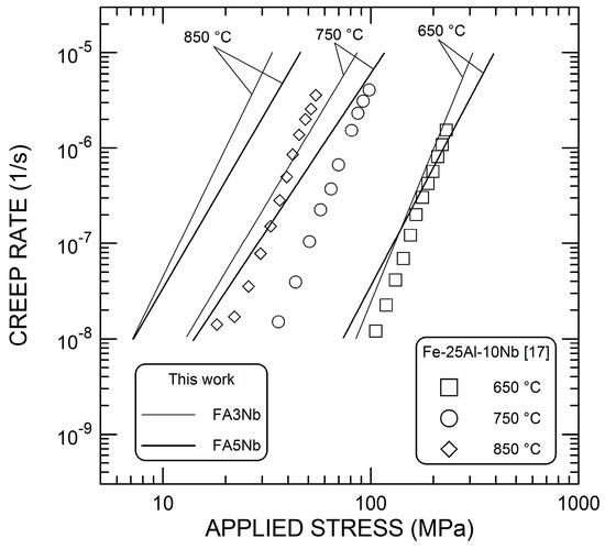 For comparison with a previously published study on the Fe-25% Al alloy that contained the amount of niobium close to the eutectic composition [17], Figure 10 shows the creep rate vs. the stress data obtained at three temperatures. It has to be emphasized that the data in [17] were obtained by the identical testing technique, i.e., by the stepwise compressive testing. The lines for the present alloys at a temperature of 850 °C were obtained by interpolation. Two different features follow from the comparison of the data: