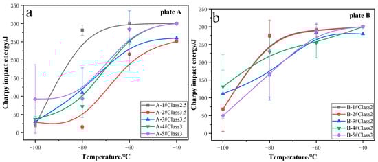 - As the degree of centerline segregation increases, impact energy decreases gradually and DBTT increases. Meanwhile, the variability in impact toughness becomes larger, especially when the degree of segregation exceeds Mannesmann class 2; i.e., at −60 °C, the variability range in toughness (~75 J) of plate A (segregation degree higher than class 2) was higher than plate B (~40 J, segregation degree almost at class 2); at −80 °C, the variability range in toughness of plate A (~260 J) is higher than plate B (~75 J);