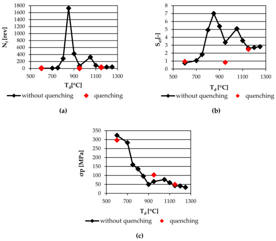 (a) Dependence of number of turns to failure (Nf) on test temperature (Td); (b) Dependence of limited deformation intensity (Sef) on test temperature (Td); (c) Dependence stress (σp) on test temperature (Td).