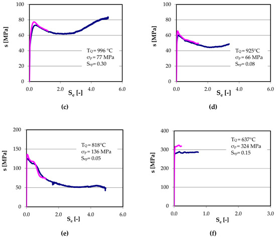 Dependence of stress σ on deformation intensity Se at selected temperatures: (a) TQ = 1220 °C, Nf = 45.6, sample X3; (b) TQ = 1143 °C, Nf = 38, sample X9; (c) TQ = 996 °C, Nf = 326.8, sample V9; (d) TQ = 925 °C, Nf = 72.8, sample X6; (e) TQ = 818 °C, Nf = 284.4, sample V5; (f) TQ = 637 °C, Nf = 5.5, sample V1; (pink curve–with parameter, blue curve–without parameter; Sep–peak intensity of deformation, σp-peak stress).