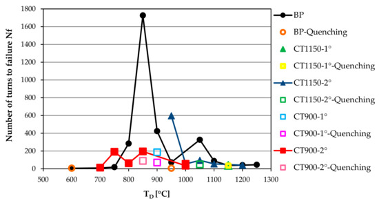 4. The two-degree cycling of temperatures according to CT1150 and CT900 results mostly in decreased plasticity compared to the basic programme. The most significant effect of cycling was evident for the CT900 programme below the maximum plasticity at 850 °C in the basic programme, when the number of turns decreased from 1726.9 to 195 turns. A similar decrease, but less pronounced, was observed in CT1150 cycling below the maximum plasticity in the basic programme at 1050 °C, where the number of turns decreased from 326.8 to only 95.4.