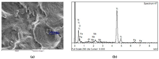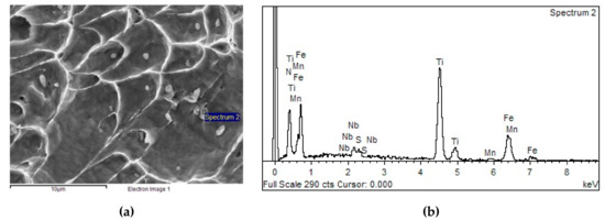 (a) Fracture of sample Y4, CT1150-2°, Nf = 95.4, Td = 1050 °C; (b) EDX spectrum from the particle in Figure 8a-Fe, Ti, Mn, N, O, S, C, Al, Nb, Mg.