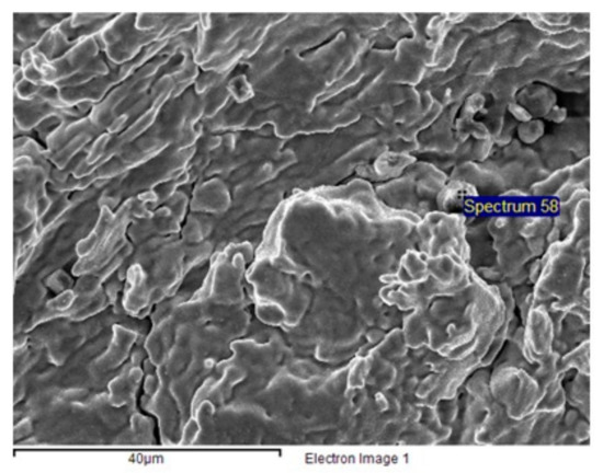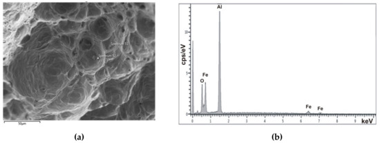 (a) Fracture of sample Z6, CT900-2°, Nf = 195.5, Td = 850 °C; (b) EDX spectrum from particle in Figure 12a-Fe, O, Al.