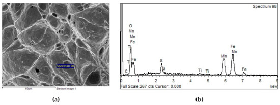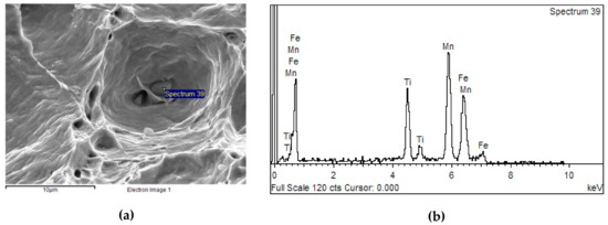 In the maximum plasticity area much larger average size of particles was confirmed, reaching 105 nm [35]. SEM analysis revealed in the temperature region near to maximum plasticity (sample X5) very deep dimples of cratered features and fine dimples on the periphery, Figure 8a. EDX analysis confirmed the presence of Fe, Ti, Mn at the bottom of deep dimples (Figure 8b), probably precipitates of FeTi, as in Reference [2] and the presence of Fe, Mn, S, probably FeMnS at the bottom of fine dimples.