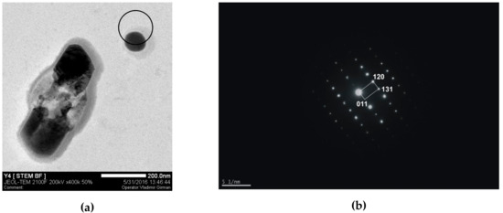(a) TEM, particles in sample Y4, CT1150-2°, spherical particle on the basis of P, Fe, Nb, Ti, O, Cu; (b) Diffraction pattern, sample Y4, (Fe,Nb)P4 phase.