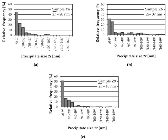 These results suggest that the particle size significantly influences plasticity even after cycling of temperatures. The presence of smaller particles responsible for the deterioration in plasticity compared to the basic programme can be attributed to the nucleation of new precipitates in subcooling during repeated phase transformation according to both programmes (Table 2 and Table 3). These results confirm the authors’ assumption [23] that sudden subcooling from the maximum temperature at phase transformation γ/α supports nucleation of new precipitates at the γ/α interface due to low interstitial solubility in ferrite compared to austenite. Sample Z9 (Table 3), which was quenched directly from the test temperature after plastometric testing, also revealed the formation of new particles. The average size of the precipitates was only 18 nm, with up to 51% occurrence of even smaller particles of ≤ 9 nm (Figure 12c). This means that in this test, the particles formed during repeated phase transformation directly at 850 °C were fixed. Sample Z6 represents the state without quenching (Table 3), i.e., after testing the sample was cooled slowly without quenching. As a result, the average particle size was greater, as precipitation allowed for growth over a longer time and thus further nucleation of the particles (Figure 12b).