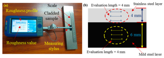 The cutting performance of AWJC for machining clad composite is assessed in terms of surface roughness. During each experimental run, a 40 mm cut-length was machined on an abrasive water jet machine (model: WC3WB1212H). Upon the completion of each experiment, the surface roughness was measured for both of the layers of clad composite using surface texture meter (model: Surtronic S128). An evaluation length of 4 mm and a cut-off length of 0.8 mm was used for roughness measurement. For each layer, three readings of roughness were taken, and then the average value was reported. The measurement procedure adopted for taking the measurements of surface roughness at both the layers has been elaborated in Figure 2. The value of roughness has been taken for both the layers, i.e., stainless steel (Ra(SS)) and mild steel (Ra(MS)). Four key parameters were considered as the input variables namely; stand-off distance (SOD), abrasive mass flow (AMF), feed rate (FR) and water pressure (WP). The selection of these parameters was based on the rationale that their impact has been noted as significant on surface roughness in the reported literature [15,16,17,18,20]. Preliminary trials were also performed for selecting the appropriate levels of the selected control variables. Striation formation and jet deflection, the two problematic issues associated with the AWJC, have been given due consideration during preliminary trials. The selection of the levels is done in such a way that the chances of striation formation and jet deflection would be minimal. It has also been ensured that abrasive laden jet can produce a through cut in a single pass. All the parameters have three levels, except the stand-off distance that has two levels. It was noted during the preliminary experimentation that if the value of SOD was reduced below 1 mm, the retraction of the abrasive grains damages the abrasive nozzle. On the other end, if the value of SOD is raised beyond 2.5 mm, the value of the effective width of the jet is enlarged before the interaction with the target surface. As a result, the kinetic energy of the abrasive laden jet has been reduced and it cannot produce a through cut. It is important to mention that the workpiece placement is also a critical consideration in this study as material comprises of two layers and both have different mechanical properties. The workpiece was placed in such a manner that SSL lies at the top, whereas MSL faces the bottom. The rationale for selecting this work orientation is to take advantage of abrasive particles’ kinetic energy because SSL (55 HRA) is harder compared to MSL (48 HRA). In fact, at the start of the cut, the abrasive laden jet has more penetration power owing to its higher kinetic energy. The magnitude of this energy reduces as the jet moves downward because this energy is consistently consumed in cutting the material. Therefore, it is advantageous to place SSL at the top so that the harder layer can be machined due to the higher kinetic energy of the abrasive jet. Though the abrasive jet consumes its energy to cut the upper layer, the lower layer of the material is softer, hence it can also be machined. Parameters and their levels are tabulated in Table 3. The rest of the control variables were treated as constant factors.
