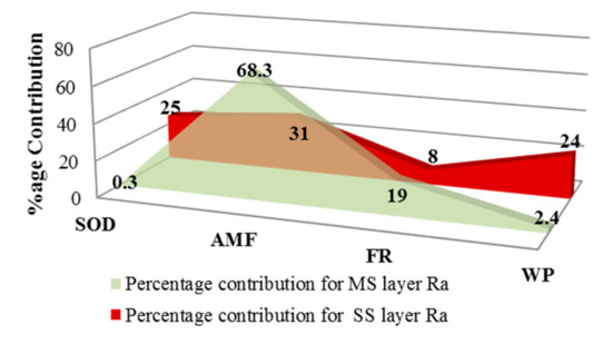 Analysis of variance has been carried out for examining the parametric significance with respect to the selected responses. A confidence interval of 95% has been defined as a criterion for rating a parametric effect as significant. According to this criterion, any control variable having a p-value less than 0.05 would be considered as significant for the selected output variable. It is evident from the results of ANOVA presented in Table 5, that SOD, AMF, and WP are the significant control factors for the surface roughness of the stainless-steel layer (SSL). Whereas, the roughness of the mild steel layer (MSL) is primarily influenced by AMF and FR as described in Table 6. The percentage contribution of control variables for both the surfaces has also been calculated as shown in Figure 3. It has been found that the percentage contribution of input parameters namely; SOD, AMF, FR and WP for controlling the surface roughness of SSL is 25%, 31%, 8%, and 24%, respectively. Whereas, in case of MSL surface roughness, AMF holds the leadingly high percentage contribution of 68.3% followed by FR which has a percentage contribution of 19%.