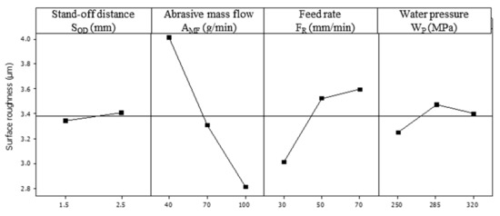 Considerable research has been conducted in the past to understand the mechanism and to investigate the parametric effects in AWJM with respect to surface roughness. For instance, Babu et al. [15] have found that water pressure (WP) is the most contributing factor for Ra during AWJM of brass-360. Uthayakumar et al. [16] also reported that WP was the prominent factor affecting the surface morphology of Ni-based super alloy cut by abrasive water jet. In another piece of research, it was concluded that the surface roughness decreased as the WP and abrasive mass flow (AMF) increased. Contrarily, a reverse trend is observed for the stand-off distance (SOD), traverse speed (FR) and abrasive grain size during the AWJM of ceramics tiles [17]. The cutting capability of AWJM for the cutting of gemstones can be seen in [18]. It was reported that the feed rate (FR) and depth distance of jet were the two influential factors for the Ra of cut specimens of gemstones. Karakurt et al. [19] evaluated the impact of five input parameters, namely: feed rate; FR, standoff distance; SOD, abrasive grain size, water pressure; WP and abrasive mass flow; AMF on kerf width during the machining of granitic rocks. It was found that traverse speed and standoff distance were the two contributing factors for kerf width. A multivariable regression model was also developed and validated. Selvan et al. [20] investigated the effect of WP, SOD, FR and AMF for the cutting of cast iron. Jagadish et al. [21] developed the optimal parametric settings of three abrasive water jet input factors, namely: water pressure, standoff distance and nozzle speed, for the machining of green composite using response surface methodology. Results revealed that the surface roughness was found to be minimum at a water pressure of 150 Mpa, standoff distance of 3.5 mm and 125 mm/min nozzle speed. Yuvaraj et al. [22] carried out multi-objective optimization using Technique for Order Preference by Similarity Ideal Solution (TOPSIS) approach during abrasive water jet machining of aluminum alloy (AA5083-H32). Five responses namely: penetration depth, cutting speed, kerf taper, top kerf width and Ra were simultaneously optimized using TOPSIS technique. A water pressure of 300 MPa, traverse rate of 120 mm/min, standoff distance of 1 mm and AMF of 360 g/min were the optimal settings.