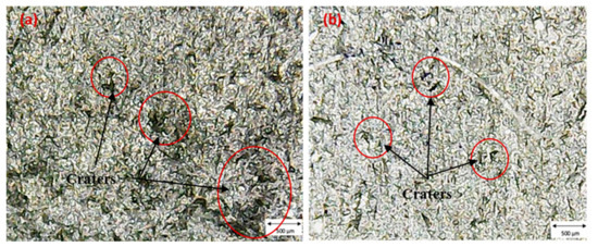 The trend of WP with respect to the surface finish of both the layers has been described in Figure 5 and Figure 6. Experimental results revealed that the value of surface roughness is increased with the increase in WP from 250 MPa to 285 MPa. The reason behind this trend is the increase in the magnitude of kinetic energy of the abrasive jet with the rise of the value of WP. This increment in the kinetic energy of the jet accelerates the abrasive particles more energetically. When these accelerated abrasive particles encounter the target surface, they impart a greater amount of shear load during their collision due to having larger kinetic energy. Consequently, deeper crates are formed at the machined surface which promotes the surface roughness. The same has also been validated in the SEM micrographs of the machined area presented in Figure 11. At larger WP (285 MPa) deeper craters are formed, while at lower WP (250 MPa) shallow craters are produced. Owing to the decrease in the craters’ depth the surface finish is improved as highlighted in Figure 11. However, an increased trend has been observed for the surface roughness of both the layers with the rise in WP from 250 MPa to 285 MPa. However, this impact is statistically significant for SSL only as mentioned in Table 5 and Table 6. This is because the abrasive jet loses its kinetic energy as it moves down along the workpiece thickness. The kinetic energy of the abrasive laden jet is successively dissipated due to its collisions with the work surface. This is why the change in water pressure is unable to produce a noticeable change in the surface roughness of MSL as the jet’s kinetic energy has already been dissipated by the upper layer of stainless steel (having higher hardness of 55 HRA). Therefore, the effect of change of WP turns out to be insignificant. It is interesting to note that the surface roughness of both the SSL and the MSL layers was reduced as the value of WP rose from 285 MPa to 320 MPa. This was attributed to the reason that at a higher WP the shear load on the abrasive grains is increased. Bouad et al. [29] claimed that if the shear load experienced by the abrasive grain is more than its crushing load, the abrasive particle gets fractured. The cutting capability of the crushed particles is reduced, and thus shallow craters are formed. Subsequently, the magnitude of the surface roughness is reduced.