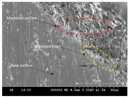 Based on the parametric effects demonstrated in Figure 5 and Figure 6, it has been envisaged that lower FR has a positive impact on the surface finish of the clad specimen. At a higher value of FR, surface roughness of both the layers has been reduced. The main reason behind this trend is the contact time between the abrasive laden with the target surface. When the magnitude of FR is higher, abrasive laden traverses at a faster rate along the cut dimension which in turn reduces the contact time between the abrasive laden waterjet and the target surface. This reduction in the contact time upsurges the cutting rate during AWJC. However, this increase in the cutting rate is associated with a prominent drawback of generating non-uniform shearing of material from the target surface. Thus, non-uniform occurrence of shearing provides poor surface quality. The same has also been witnessed by the SEM micrograph shown in Figure 10. A similar trend of FR with respect to surface roughness has also been cited in another work [8].