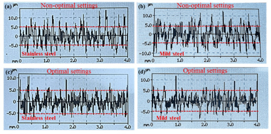 A confirmatory experiment has been performed after finding the optimal parametric combination through WSN to authenticate the developed optimal settings. The results of the experiment are tabulated in Table 9. It has been revealed that the optimal parametric combination provides a reduction of 34% in SSL surface roughness and 11% in MSL surface roughness. Moreover, the difference between the roughness values of the constituent layers is also observed to be quite small of just 0.03 µm magnitude. These results have also been validated from the roughness profiles recorded for the samples machined at the optimal and non-optimal parametric settings, as shown in Figure 12. At the non-optimal parametric settings of control variables larger surface irregularities are prominent at both the surfaces. On the other end, surface irregularities at both the layers and their respective difference is found reasonably small as highlighted in Figure 12.