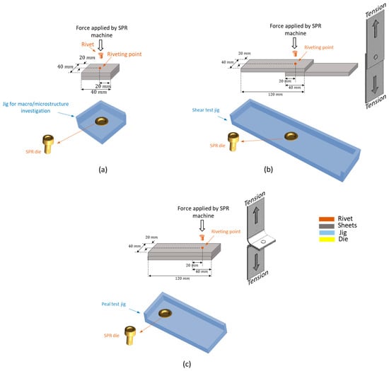 Schematic representation of the jigs and the stacks used to join AA6082-T6 sheets using SPR for (a) macro- and micro-structure investigation, (b) shear strength, and (c) peel strength tests of the joints.