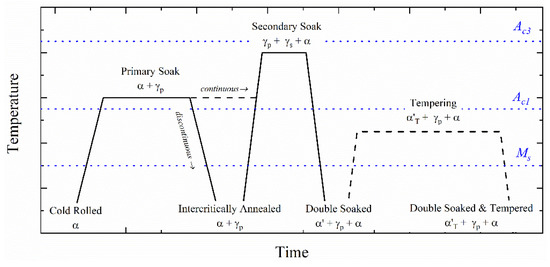 Schematic of the double soaking and double soaking plus tempering heat treatment. Expected changes in microstructure are indicated: Ferrite (α), primary austenite (), secondary austenite (), martensite (α’), and tempered martensite ().