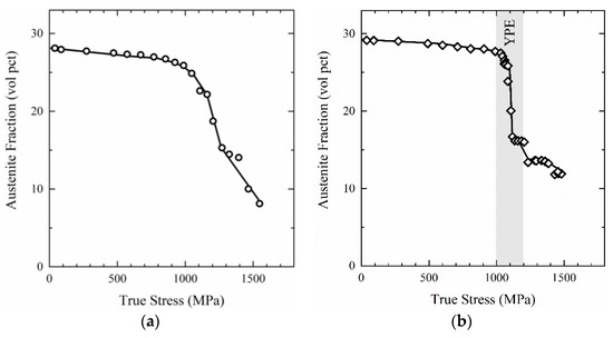 In the elastic lattice strain data for the DS-T sample, shown in Figure 6c, three stages of deformation can also be identified. Following the reversible elastic deformation of and in stage I, stage II was initiated by yielding in austenite at a macroscopic true strain of 0.0034 and corresponding estimated macroscopic true stress of 624 MPa, as indicated in Figure 6d. Following the initiation of stage II, stress in both and continued to increase as shown by the increasing elastic lattice strains in both phases. During stage II, austenite fractions remained nearly constant, indicating that the strain-induced transformation of austenite was not yet occurring. The yielding of the phase, at a macroscopic true strain of 0.0041 and corresponding macroscopic true stress of 718 MPa, initiated stage III. During stage III, stress levels in austenite were relatively constant and austenite fractions began to decrease. The most rapid rate of austenite transformation occurred during the YPE, as identified in the macroscopic true-stress, true-strain curve, after which the transformation rate slowed significantly. The corresponding elastic lattice strain for the phase increased slightly throughout stage III with increasing macroscopic true strain, indicating increasing stress in the phase.