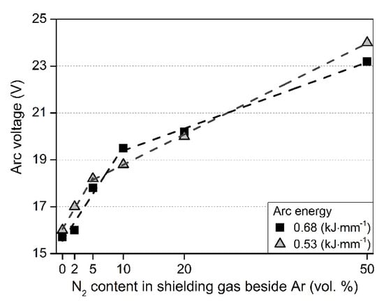 - During TIG welding, the arc voltage is increasing linearly with the increasing N2 content in the Ar shielding gas. The slope of this linear relationship is different in the 5 to 10 vol. % N2 range. The breakpoint of the slopes is different in the case of the two arc energies: 10 vol. % N2 in case of 0.68 kJ·mm−1 and 5 vol. % N2 in case of 0.53 kJ·mm−1.