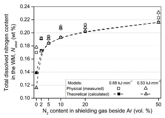 - The higher arc energy (larger molten pool surface and volume) resulted in less Nsteel content in the WM in the case of the Ar welded samples; 0.178 wt % for 0.53 kJ·mm−1 and 0.170 wt % for 0.53 kJ·mm−1.