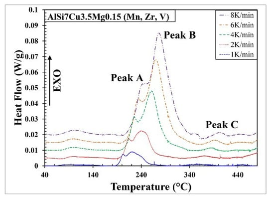 - DSC runs of AlSi7Cu3.5Mg0.15 (Mn, Zr, V) alloy present three major exothermic events (peaks A, B, C). These peaks correspond respectively to the growth of GP zones + β′′ + Q′, θ′ and θ.