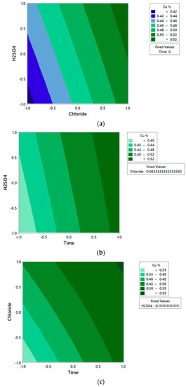 Table 6 shows ANOVA analysis. There is no significant effect (p > 0.05) of the interactions concentration of chloride concentration of H2SO4 and time-concentration of H2SO4 in copper extraction, complying with the theory that the increase in sulfuric acid concentration does not have a great influence on the leaching of chalcocite above 0.02 mol/L [19,22]. Rather, it is only the time-concentration interaction of chloride that must be considered in the model. Additionally, the effects of curvature of the variable chloride concentration and H2SO4 concentration do not contribute significantly to explaining the variability of the model. On the other hand, the linear effects of chloride time and concentration contribute to explaining the experimental model, as shown in the contour plot of Figure 2.