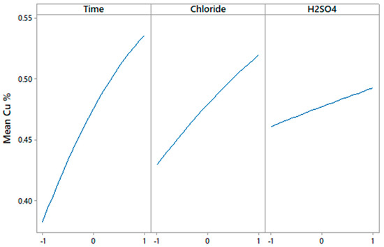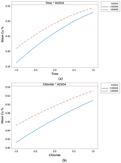 Figure 4 shows the mean Cu extraction at different combinations of factor levels. In the interaction time-chloride, the lines are not parallel, and the plot indicates that there is an interaction between the factors. On the other hand, the interaction between time-H2SO4 and chloride-H2SO4 is low.