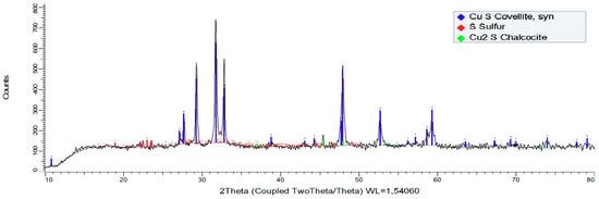 Figure 6 shows a residue analysis performed under the conditions of 50 g/L Cl− and 0.5 mol/L H2SO4, in a leaching time of 4 h. The result of this XRD is useful to understand the behavior of the chalcocite in a short time and in low reagent conditions, and to observe which mineralogical species are forming. The results show a high formation of synthetic covellite (77.34 wt %), early formation of elemental sulfur (20.20 wt %) and a remaining chalcocite (4.46 wt %), which still does not dissolve. From this, it follows that the transformation of chalcocite to covellite is faster than the transformation of covellite to elemental sulfur, which is similar to that observed in Equations (4) and (5), also, according to Figure 5, the slope of the curve is decreasing slowly, which means less kinetics of copper dissolution as a function of time. In the investigation of Senanayake [28], it is reported that the dissolution of chalcocite in a chloride-iron-water system at 25 °C occurs at potentials greater than 500 mV with a pH < 4, while in the research of Miki et al. [13] it is reported that the chalcocite dissolution occurs rapidly at a potential of 500 mV but stops when it reaches 50% copper extraction. When the potential increases to 550 mV, this extraction increases again because once it reaches 50% copper extraction, the mineral present is mainly covellite, which has a dissolution kinetics lower than the chalcocite and that needs potentials greater than 600 mV to dissolve.