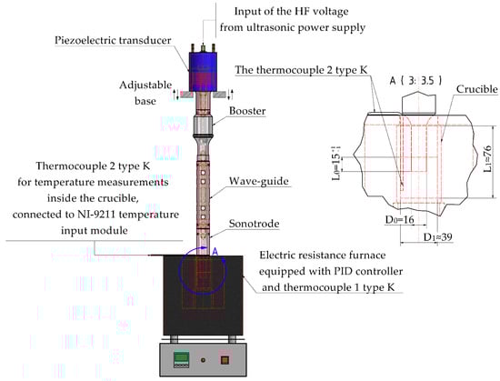 Schematic diagram of the ultrasonic vibration (USV) process showing the mechanical parts of the ultrasonic system, crucible dimensions (D1 and L1), the sonotrode tip diameter D0, the immersing distance D0 of the sonotrode inside the melt, and the additional thermocouple 2 and its location for monitoring the melt temperature. All dimensions are by mm.