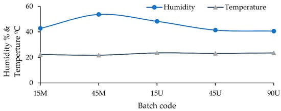 The humidity and temperature were monitored and recorded using a thermo-hygrometer Testo 625 (Testo, Lenzkirch, Germany) within an hour time window during the casting process for each sample, and the average measurements for the samples in their batch are presented in Figure 2.