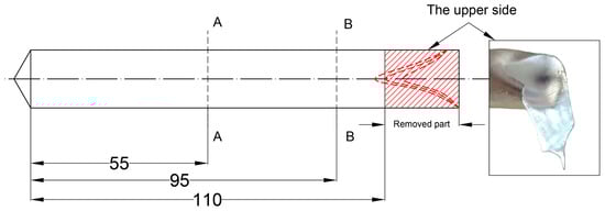 Samples for microstructure characterization, impurities and the associated surface porosity evaluation, and for chemical composition measurements were taken by sectioning the castings in each batch perpendicularly to their longitudinal axis, as represented in Figure 3. After cutting and polishing the section A–A of as cast-samples, the defects in the cross-section surface were evaluated and compared. Further specific analyses were conducted for the first and second phases at the same section A–A. Spectrometer analyses were performed at the cross-sections A–A and B–B.