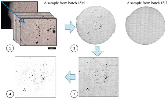 The sectioned samples for microstructure, impurities and the associated surface porosity characterizations were ground using a series of increasingly finer SiC papers up to P4000 and then polished with polycrystalline 1 μm diamond suspension, followed by 0.02 μm of colloidal silica. They were then ultrasonically cleaned. The images used in evaluating the grain size and defects on the sections surfaces were obtained by a light microscope LEICA DM 2500 M (Leica Microsystems). An image processing package Fiji (ImageJ, 1.52h, National Institutes of Health, Bethesda, MD, USA) [] were used for defects evaluation (Figure 4). The samples used for microstructure characterization by light microscope were anodized using ultrasonically stirred solution of 1.25% fluoroboric acid in distilled water. The chemical composition of the produced alloys was determined using SPECTROMAXx optical emission spectroscopy (SPECTRO, AMETEK Materials Analysis Division). For each batch of spectrometer measurements, the same standard sample with accurate composition was used for a further calibration of the measurements. A FEI Nova 200 Scanning Electron Microscope (SEM) equipped with integrated X-ray microanalysis (Energy-dispersive spectrometer EDS) was used for additional microstructure characterization and chemical composition analyses of the phases and impurities.