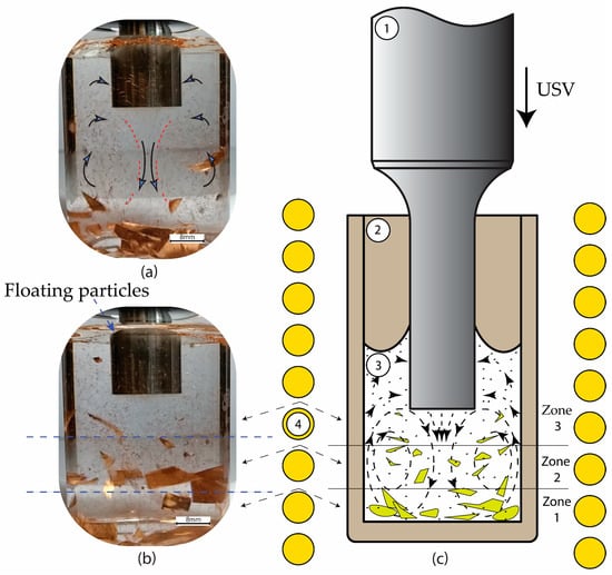 Testing USV in water with some introduced Cu segments/particles with different sizes should support the understanding of a USV application in liquid aluminum since there is some similarity with aluminum melt properties at the 700 °C temperature (close Reynolds numbers and small Ohnesorge numbers) []. Moreover, the acoustic spectra for liquid aluminum and water follow a similar pattern [], which makes water the closest candidate to resemble the liquid aluminum except what concerning the attenuation []. Figure 5a,b shows the USV application in water with introduced Cu segments/particles which simulate the state of Cu segments in the melt after the manual mixing and partial dissolution of Cu cuts. An optimized sonotrode for work in normal temperature (slightly different length) was used for the experiment in water with similar USV parameters of the high temperature experiments in the melt. Once USV was activated, the mixture was strongly agitated. The small Cu particles distributed and circulated almost all over the water volume. Medium-sized Cu segments mostly distributed in the middle, while the largest ones were close to the cup base. Based on the experiment in water, a schematic diagram of the process in the melt of different Cu zones was suggested (Figure 5c). It is worth mentioning that the acoustic flows pattern represented in Figure 5a,c was roughly similar to the typical one presented by Eskin and Eskin [] and Fang et al. [].