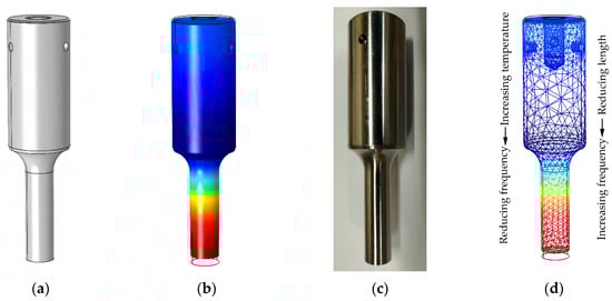 Optimization of the sonotrode for high temperature. (a) Sketching the main design. (b) Solving the model for a normal temperature and for a high temperature by changing the length after introducing the dependent properties on temperature (explained up); (c) manufacturing the sonotrode with some length tolerance for experimental analysis, taking into account that (d) the eigenfrequency at the wanted eigenmode (longitudinal vibration mode in the present study) can be reduced when the temperature increases and can be increased by reducing the length of the sonotrode. The attenuation factor inside the melt should be considered as well.
