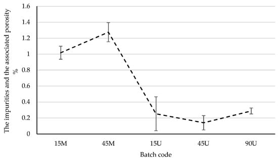 It is known that hydrogen content depends considerably on atmospheric humidity []. During alloy preparation and without any assistant refining or cleaning process, the alloy becomes massively contaminated with non-metallic impurities and hydrogen, such as the case of batches 15M and 45M. Applying USV was an efficient way to reduce defects in the batches 15U, 45U, and 90U (Figure 7).