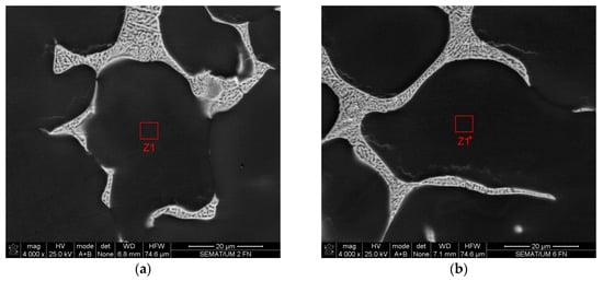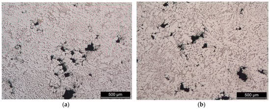 After feeding Cu and applying a holding time of 15 min, the castings had many defects—mainly impurities and pores (Figure 8a). The observed quality of the samples was relatively lower after introducing a second holding time of 45 min followed by a second manual stirring period (Figure 7 and Figure 8b). This effect was probably due to the humidity in the atmosphere, since the melt was kept for 45 min at relatively high temperature. In usual practices, many methods have been studied and applied for improving the quality of the produced alloys []. However, in the present study, any commercial or developed techniques were avoided in order to allow a clear understanding of USV effect on the quality of the produced alloys.