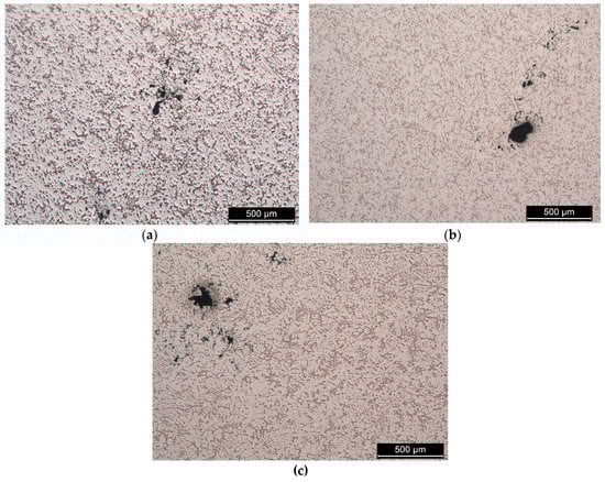 After USV treatment for 2 min, the examined cross section A–A of the samples in batch 15U showed a good section surface with reduced sizes and content of the pores (Figure 9a), compared with the manual stirred batches (Figure 8). The entire cross-sections A-A of two samples from the batches 45M and 15U are presented in Figure 4, step 2 for the comparison. In batch 45U, adding a second 2 min of USV treatment prior to casting, combined with a holding time of 45 min, produced a slightly better quality, on average. However, the produced samples had less quality variations compared with batch 15U (the error bar in Figure 7). Increasing the holding time to 90 min did not help in reducing the amount of the observed defects; inversely, the content of defects increased slightly (insignificant statistically comparing to 45U) (Figure 7 and Figure 9c).