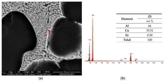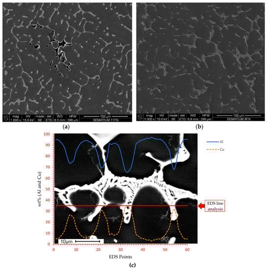 The microstructure of the produced alloys consists of typical primary α-Al dendrite surrounded by a eutectic mixture of secondary α-Al and Al2Cu (Figure 12a,b). Figure 12c shows microscale composition variations across the eutectic and the primary phase (batch 45M).