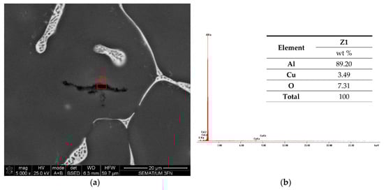 Impurities in aluminum melts can be divided into soluble and insoluble impurities. Most of the insoluble ones are oxides from the raw materials, and other impurities come from the crucible and melting tools. The well-known fragile thin layer of oxide 10–15 μm which usually protects liquid aluminum is a main source of those oxides in the melt []. It should be noted that feeding Cu into the melt in normal atmosphere should be fast enough to prevent a severe oxidation of the surface if no protection method is employed. Figure 10 and Figure 11 show examples of impurities observed in the samples.