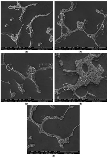 Microstructure of the produced alloys without chemical etching (a) batch 15M, (b) batch 45M, (c) batch 15U, (d) batch 45U, and (e) batch 90U. The USV-treated samples, as indicated the dotted circles, exhibited generally finer eutectic morphology.
