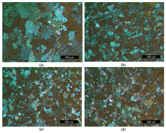 The manually stirred samples exhibited normal and coarse microstructures (Figure 14a), while the samples treated by USV showed refined microstructures (Figure 14b–d). The average grain size (at 1 mm from the outer edge of section A–A) was decreased to (70–83) μm in the ultrasonically-treated alloys.