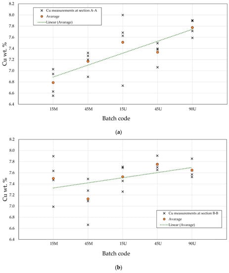 It is evident from Figure 15 that applying USV or/and increasing the holding time increases the dissolved content of copper and improves alloy homogenization. The samples of batch 90U had the maximum average Cu content at the middle section A–A (Figure 15a). Compared with 45U and 90U, the Cu measurements of the batch 15U samples showed a relatively high divergence around the average value (Figure 15a) as well as a high difference around the average value of the measured defects (Figure 7). The variation in Cu content around the average value in batch 15U at the middle section A–A (Figure 15a) implies that the complete dissolution of Cu was not achieved yet.