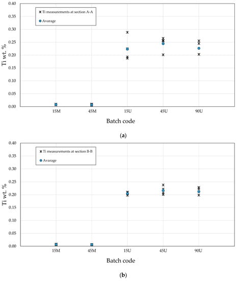 Optical emission spectroscopy was used to quantify the chemical composition of the produced alloys and as a macroscale indication of the alloying elements distribution. The measurements were conducted at two locations (the cross sections A–A and B–B in Figure 3), and then the measurements were calibrated by a standard sample with an accurate and known composition for greater precision. Figure 15 and Figure 16 display the calibrated measurements and the average of Cu and Ti content, respectively, at the two specified locations. The distribution of the measurements around the mean values represents the variability in Cu% content and gives an indication of alloy homogenization over macroscale distance. Due to the USV treatment using a titanium-based sonotrode, the erosion of the sonotrode introduced an average of 0.2–0.24 wt.% of Ti in the alloys (Figure 16).