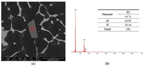 where ΔTM, ΔP, ΔV, and ΔH are the changes in melting temperature, pressure, volume and enthalpy, respectively; and T is the absolute temperate. Without the existence of Ti, the survival of the nucleus is difficult, since the melt of Al–8Cu was ultrasonically-treated in a temperature far from its liquidus temperature. Several studies reported a poor refining effect of USV using a sonotrode with Nb tip (no dispersion and dissolution of TiAl3) in a temperature higher than the liquidus temperature of the treated alloy [,]. In the current study, only few bulky TiAl3 particles (Figure 17) were observed in the center of some grains. Further EDS analyses were conducted, and a trace of Ti was also detected in the primary phase α-Al (Figure 18 and Table 3).