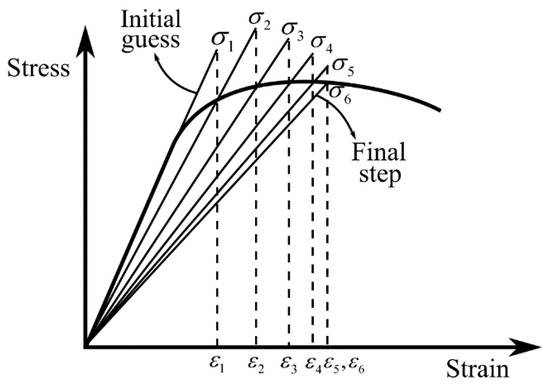 B is the adjacent vector which contains the boundary values. This equation, however, may not be always trivial to solve due to nonlinear plastic material properties (). The solution matrix A may contain the unknown displacement, which is yet to be solved. In this case an iterative solution is applied. Commercial FEM codes use Newton-Raphson or modified Newton-Raphson method for the convergence of the solution. This requires partial derivatives of the left side of the equilibrium to create an additional Jacobian matrix. The iterative solution chosen here is the direct iteration due to its implementation and solution simplicity. At each iteration step j, the material properties are linearized and updated until converge is achieved in the following form