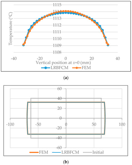 A fair comparison of FEM and LRBFCM is achievable for simple benchmark tests in practice. The LRBFCM algorithms used in this rolling simulation system have been previously compared extensively with the analytical solutions, such as bending of a cantilever beam [16], bending of a beam by uniform load [28], expansion of a cylindrical tube [28], linear compression-tension example [28], and hole in an infinite plate [16]. A systematic assessment of the MM solution procedure was based on a spectrum of relevant comparisons with the well-established FEM: Compression and tension test [16], flat rolling comparison [21], oval rolling comparison [28], width spread comparison [21], and convective cooling example [16]. In this paper are the previous comparisons, complemented in terms of internal heat generation as a consequence of the plastic deformation. A flat rolling situation is chosen to make a comparison between LRBFM and FEM results. Initial cross-section of the steel bloom is 126 × 81 mm and the effective stress-effective strain relation is defined as . The strand is compressed (reduced) from 85 mm to 65 mm height in 0.65 s. A uniform temperate field with 1100 °C is assumed initially. The Coulomb model of friction is applied at the contact surfaces with the coefficient of friction 0.1, based on the experimental results for hot rolling of steel [1]. Thermal insulation is assumed at the boundaries and the only temperature increase is based on the internal heat generation. After the deformation, the size is calculated to be 139.51 × 65 mm by LRBFCM and 139.48 × 65 mm by FEM. Comparisons of deformed shapes and temperature increase are shown in Figure 6. The maximum temperature increase is approximately 15 degrees in both cases. Five-hundred forty-four collocation nodes are used in the present meshless method in Figure 6c, and 950 quadrilateral finite elements are used in Figure 6d. The computational time spent by both numerical methods for solving the above described test is comparable, i.e., 20 CPU seconds.