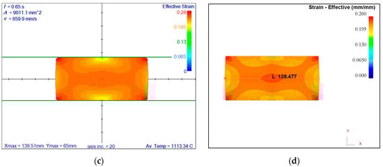 Rolling of steel is a very complex 3D solid mechanics problem. Therefore, the numerical simulation of rolling requires an extremely high computational power and time, proportional with the desired accuracy. In order to optimize the computational time, allowing the technologist many alternative simulations in a short time, a 2D slice physical model is chosen and schematically depicted in Figure 2. The deformation for any slice toward the rolling direction obeys the homogeneous plane strain assumption [1,9]. This assumption is also known as homogeneous compression, in which the planes remain planes as described by Lenard [15]. The material flow is constant, and the slice model assumption becomes more realistic, as the slices are positioned very close to each other over the contact length. The increased rolling-direction velocity of the deformed slice is proportional to the decrease in the slice area.