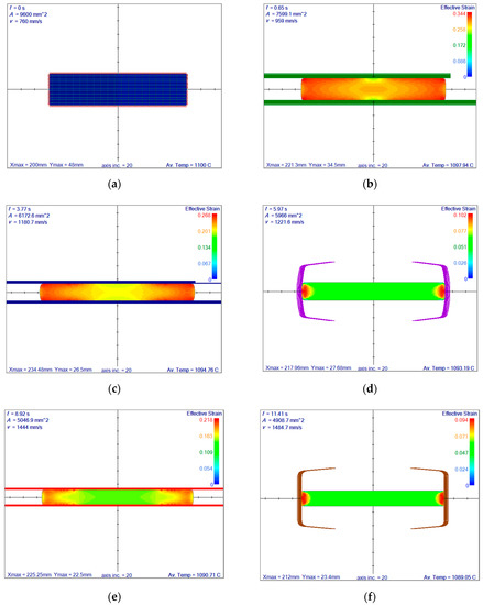 Reversing rolling mill simulation where the billet is rotated 90 degrees after each pass, starting from the second pass and 6 s of rotation time is considered. Results are shown in terms of effective stress field. (a) Initial size, (b) after first pass, (c) after second pass, (d) after third pass, (e) after fourth pass, (f) after fifth pass.
