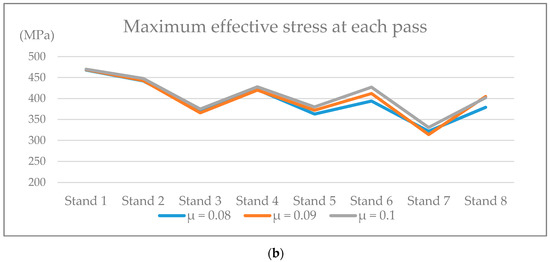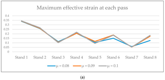 Simulation results calculated at each pass in terms of (a) maximum effective strain, (b) maximum effective stress. The increasing effect of the coefficient of friction is seen toward the end of the rolling schedule.