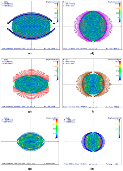 Oval rolling simulation results in terms of displacement fields. (a) After first pass, (b) after second pass, (c) after third pass, (d) after fourth pass, (e) after fifth pass, (f) after sixth pass, (g) after seventh pass.