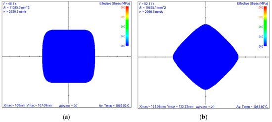 This section is the continuation of the first part of the reversing rolling mill. However, in this section, the orientation of the grooves is different than the ones used in the first section. Therefore, the billet is rotated 45 deg before it enters this section, as shown in Figure 11. In between each pass, the billet is again rotated 90 deg with 6 s of rotation time. The rolling schedule is explicitly as follows. Sixth pass: Backward direction, rotation 45 deg; seventh pass: Forward direction, rotation 90 deg; eighth pass: Backward direction, rotation 90 deg; ninth pass: Forward direction, rotation 90 deg; tenth pass: Backward direction, rotation 90°. The strand is rotated back 45 deg at the end of the simulation to observe the final shape. There are 1365 collocation nodes are distributed over the domain after the 45 deg of rotation shown in Figure 11. Effective stress field at each pass may be seen in Figure 12, as well as the final shape, which is 60.55 mm square. A 3 m-long undeformed strand elongates after rolling to 27.37 m.