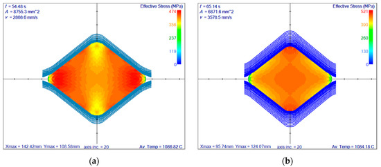 Different groove types are used in the simulations, but they can be grouped into three categories: Flat, oval, and round. For example, the simulation results shown in Figure 6 took 25 s to complete, the first rolling example took 13 min, and the reversing rolling mill simulation took 51 min to simulate. The highest reduction rates are achieved during the reversing rolling mill simulations. Especially during the first part where the reduction rates are ranging between 38% and 23%. The stress fields in this first part are higher than in the second part where the reduction rates are between 12% and 22%.